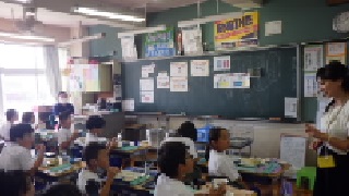 給食の時間に栄養教諭の先生に来ていただき、食育指導を行っています。今日は、牛乳を飲むと体にどのようなよいことがあるかを学習しました。