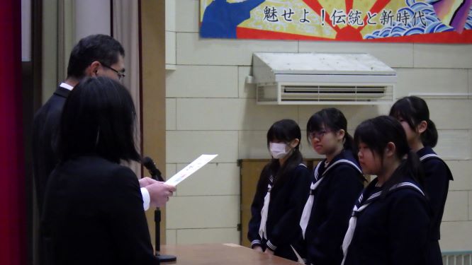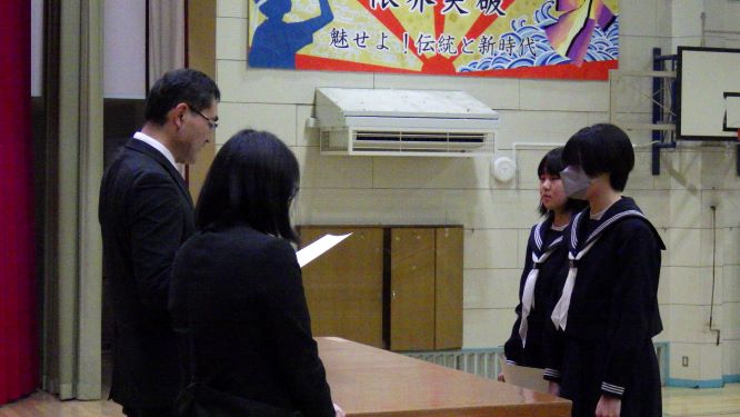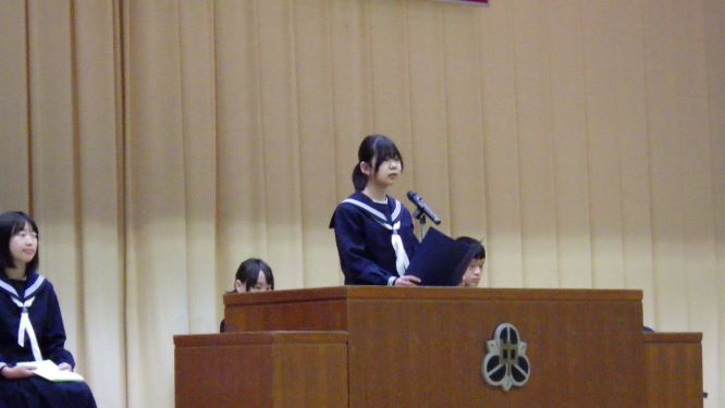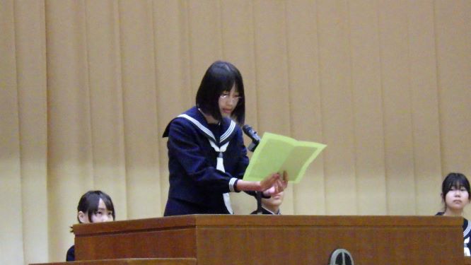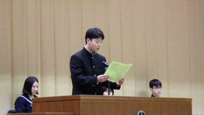 終業式では、生徒会代表でIさん、2年生代表でTさんが、代表の言葉を発表しました。