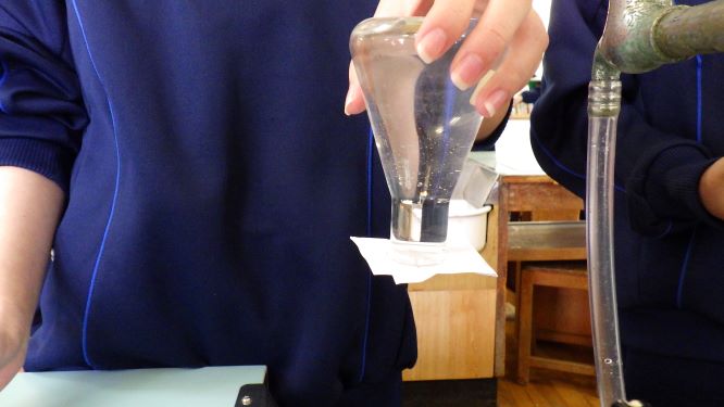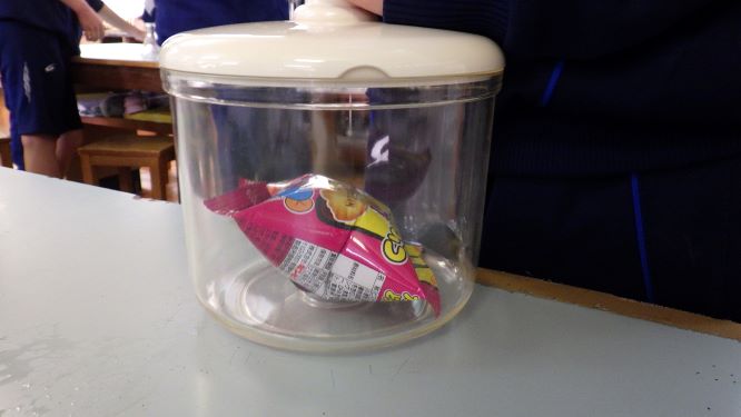 こちらは、高い山の上でお菓子の袋が膨らむ現象の再現をしていました。