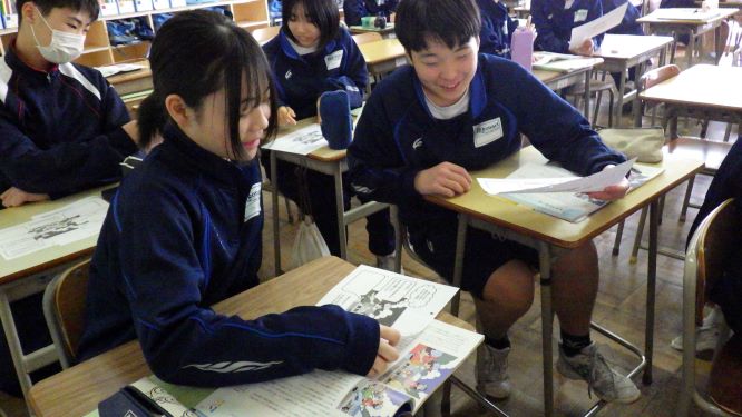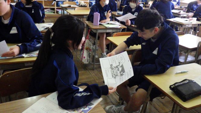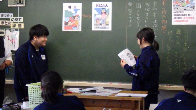 授業の中では、お話の中の登場人物になりきって、会話をしました。
