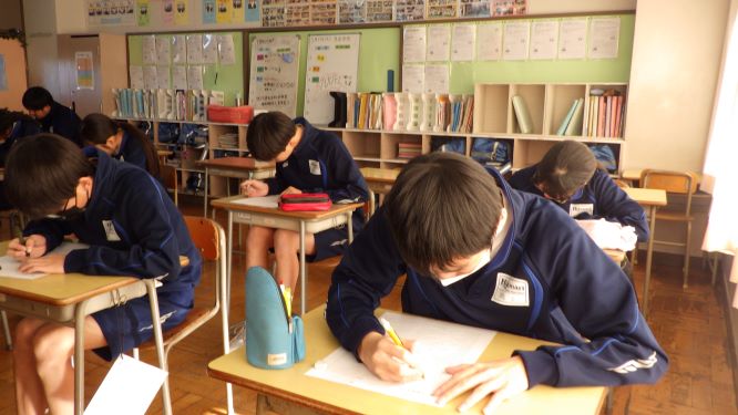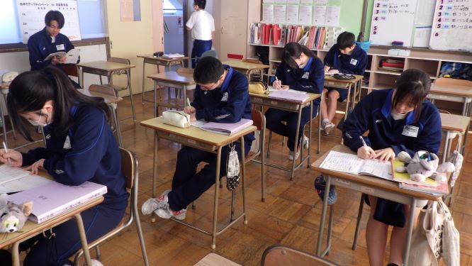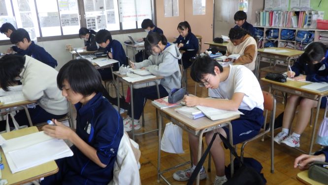 教室の机の上には過去問題集。来週から私立入試が始まりますね。