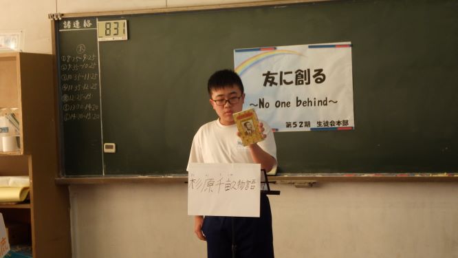 生徒朝会では、図書委員会からおすすめの本の紹介がありました。Iさんが紹介してくれたのは「杉原千畝物語」。