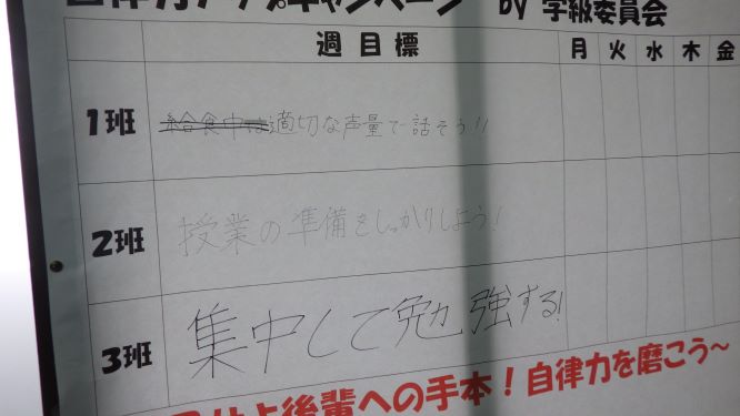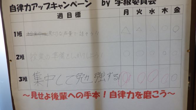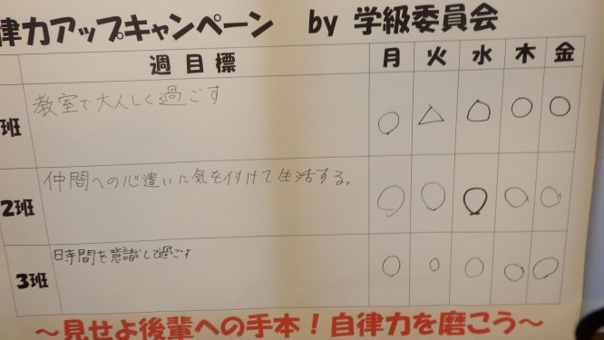 学級委員会の「自律力アップキャンペーン」の1週目が終わりました。どちらのクラスも好成績です。
