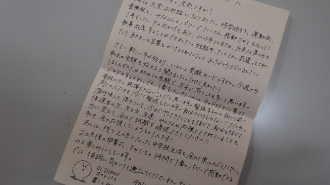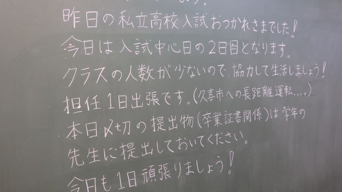 今週は寒かったですね。そんな中、入試に出かけた人もたくさんいました。担任からあったかいメッセージ。