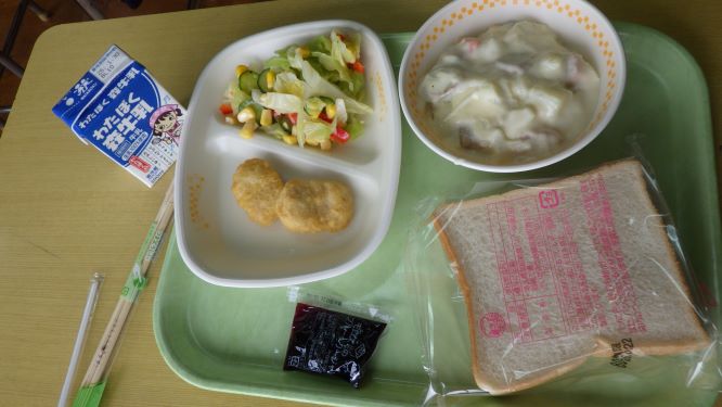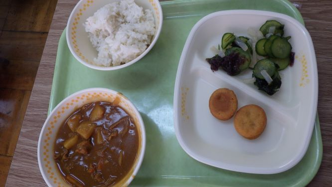 今日の給食は、ハヤシライスにドーナツという変わった組み合わせでしたが、おいしかったです。