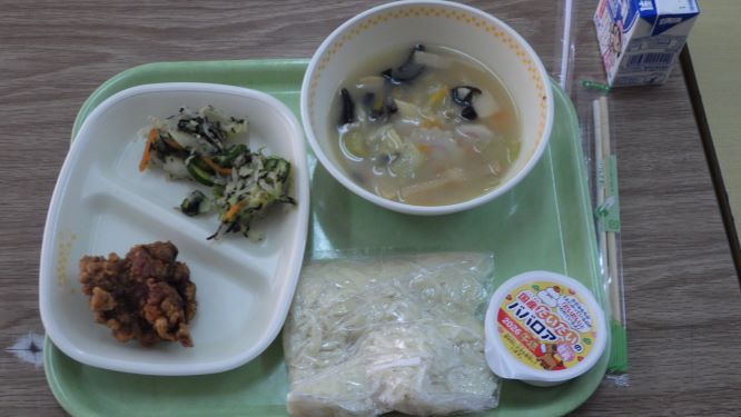 給食は人気のとんこつラーメン。スープがあったかいです。最高です。