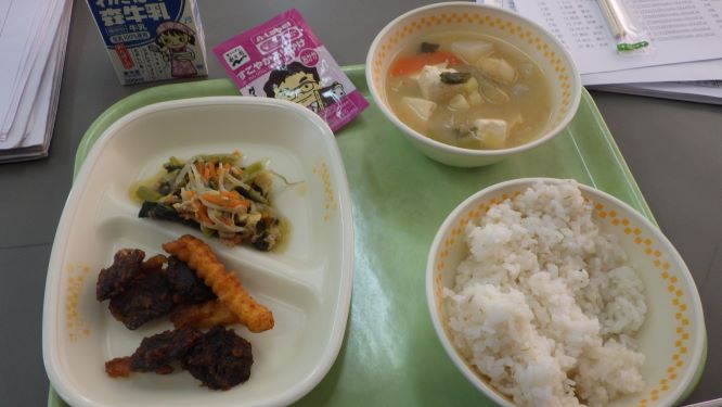 今日の給食にクジラが出ました。あまり口にすることがないですね。味はいかがでしたか。