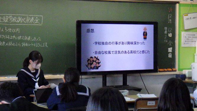 自分が調べた学校とは違う学校について、友達の発表を通してたくさん知ることができましたね。