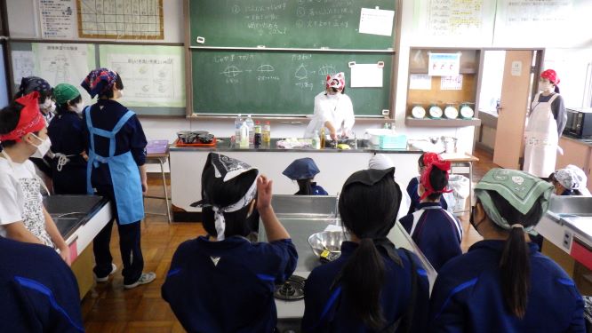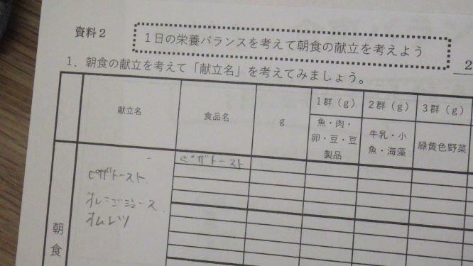 今日の家庭科の時間では、栄養教育実習で来ているT先生が、バランスの良い食事についての授業を行いました。