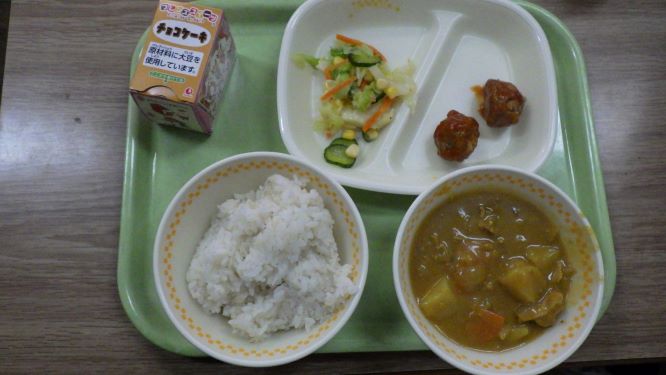 今日の給食はカレー。テストをがんばったからか、いつもよりおいしいですね。