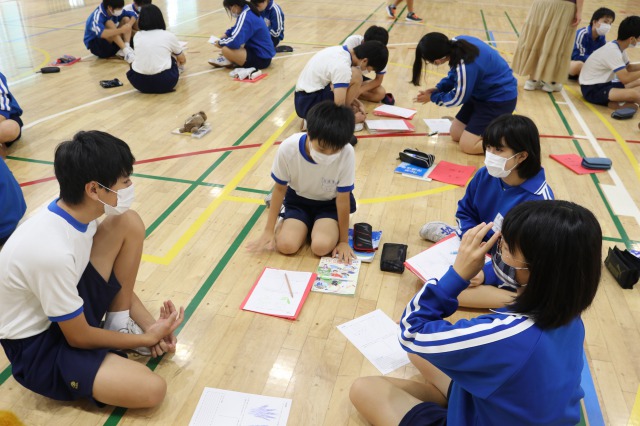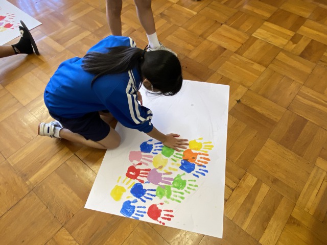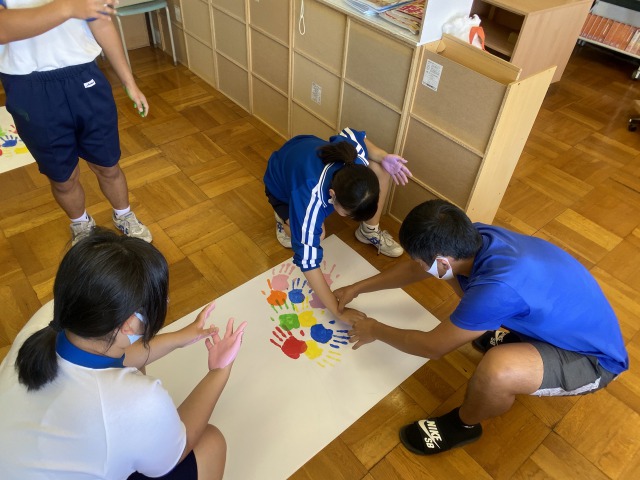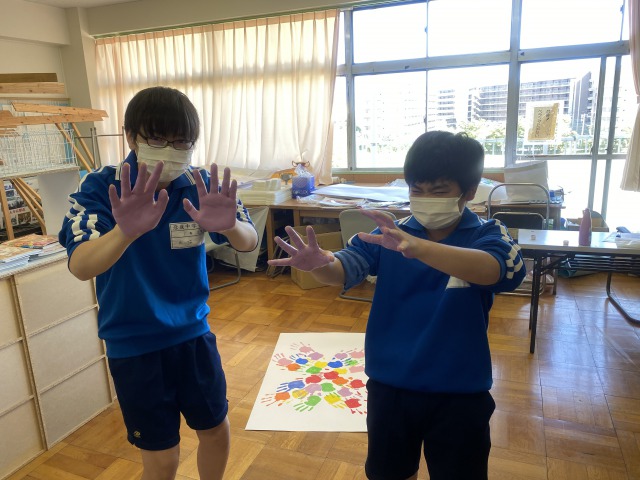 本日は、決めた形に手形をつける作業でした。この後、それぞれの手形に「いじめをしない・させないため」のメッセージを記入して完成です。2クラスとも、とても良いものができました。完成がとても楽しみです。
