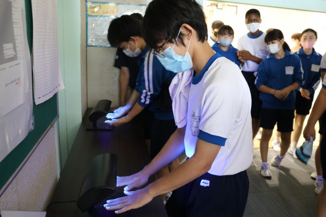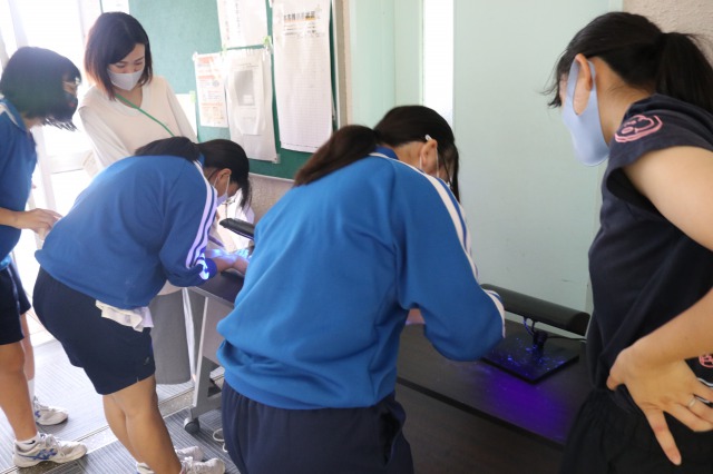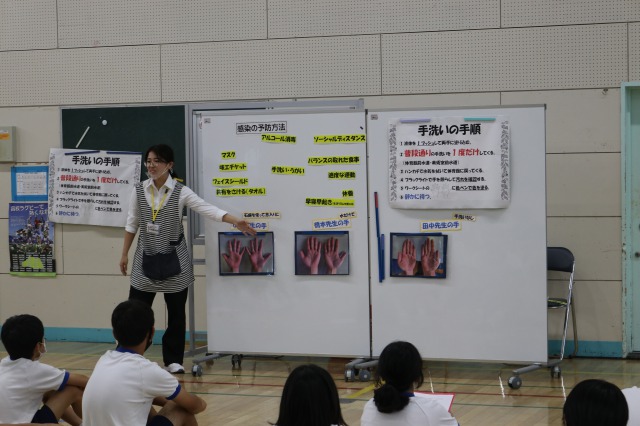 コロナウイルスの影響もあり、今まで以上に注目されるようになった手洗いについての授業でした。手洗い後に汚れが落ちているか、実際に自分たちの手をブラックライトに当てて確認するなど体験的なとても良い授業でした。