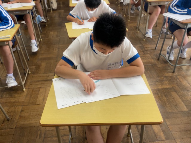 本日は第1回実力テストです。教科は、国語・数学・社会・理科・英語です。