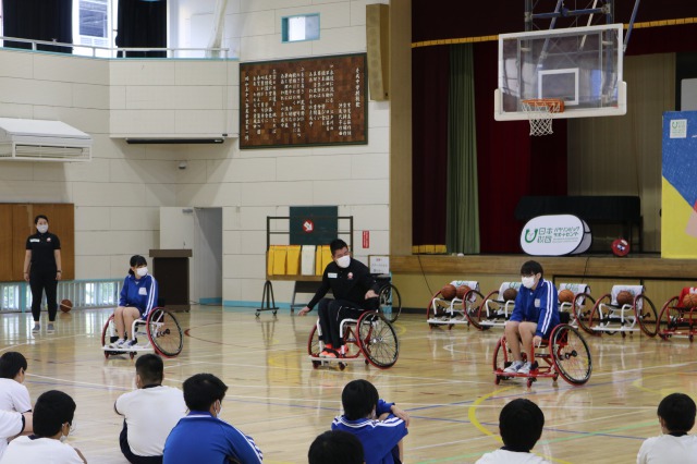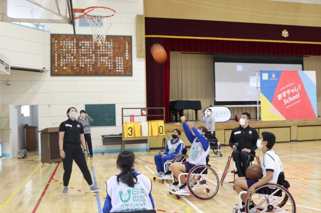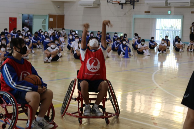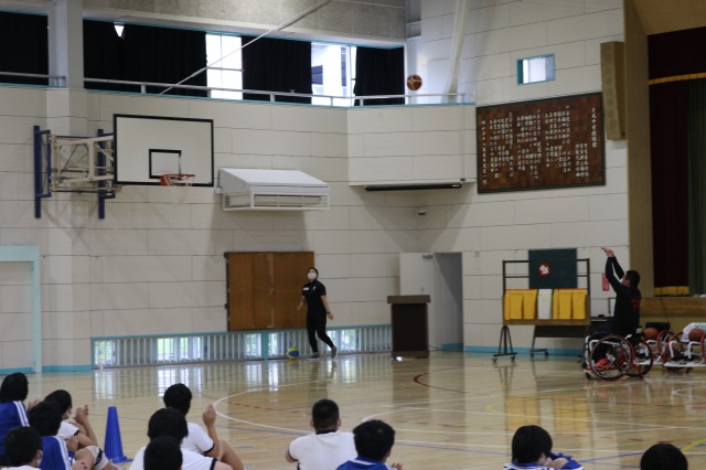 コロナ禍のため全員が体験することはできませんでしたが、数人が実際に競技用車椅子に乗り、フリースロー体験を行いました。