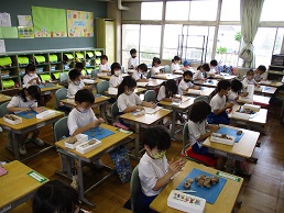 最近、雨の日が続いていますが、1年生は、休み時間など教室で粘土や自由帳、
