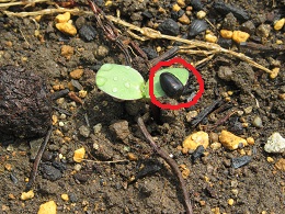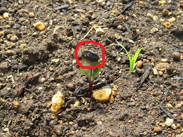 毎日わすれずに水をあげていたから芽が出たときはうれしかったです。子葉の近くを見てみると、近くの地面にたね