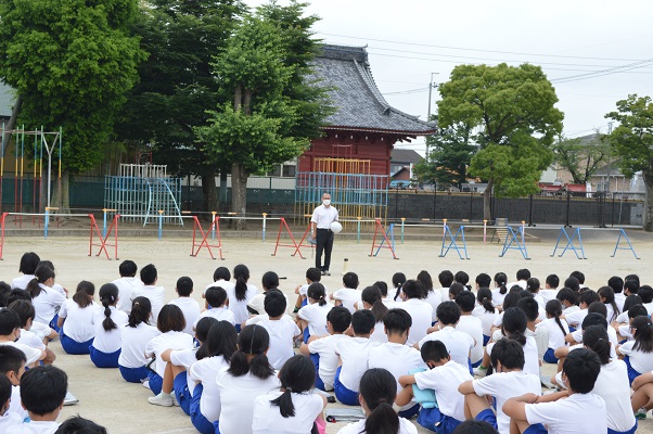 校庭でプール開きを行いました。体育主任から水泳学習の話(プールを大切に使う、ルールを守る、無理をしない)を真剣な態度で聞きました。また、各学年から水泳学習のめあてを発表しました。どの学年も堂々としていて水泳学習への意欲が感じられました。水泳学習後、「泳げるようになった。」「記録が伸びた」と子どもたちから聞こえてくるのが楽しみです。