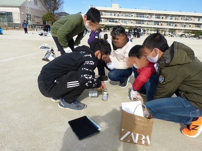 6年理科。次々と自分たちで考えた方法で実験し、他の班の方法を比べながら、安全に実験しています!