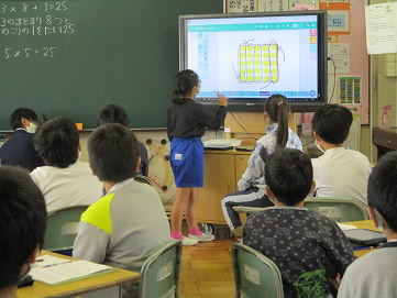 4年算数。色々な教具を使って、子ども達が一生懸命学びました。一人1台のタブレットもよくわかる!