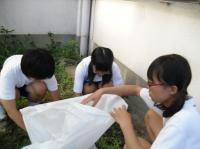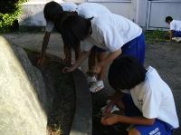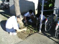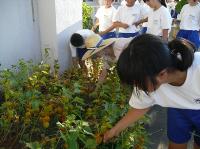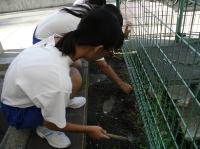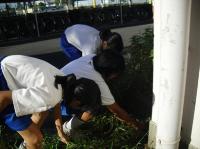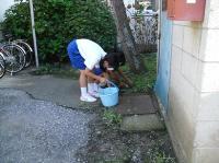 北校舎側の自転車置き場付近で。ばけつの中には抜いた雑草がたくさん。