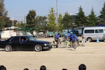 二人乗りの自転車と傘差し運転の自転車とが衝突し、そのはずみで荷台に乗っていた人が車道に出され、走ってきた車と衝突