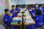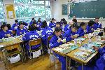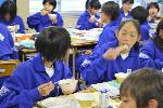 1年生のあるクラスで班ごとに席をつくり、楽しく給食を食べている様子をご覧ください。