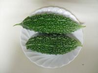 右の写真が初収穫のゴーヤです。写真のものよりは少し大きめです。