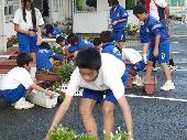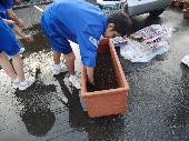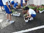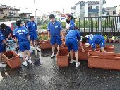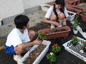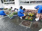本校にはたくさんのプランターがあります。夏から秋にかけての花苗の植え替え作業には、多くの生徒ボランティアが参加してくれました。土を入れる生徒、苗を植え付ける生徒、プランターを設置する生徒に分かれ、それぞれが和気藹々と作業を進めている姿が見られました。