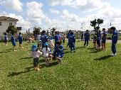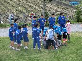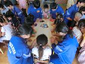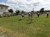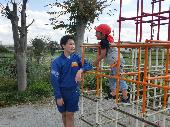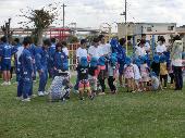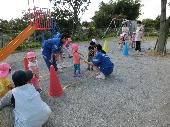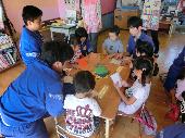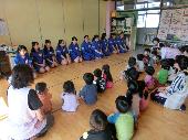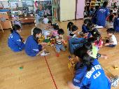 昨年度から養生された芝生のみどりが鮮やかな上口保育所では、恵まれた好天の下園児たちが遊んだり部屋の中でおもちゃで遊んだりしていました。生徒たちはわずかな時間の中で園児たちとふれ合うことができました。中には大勢の園児に囲まれて笑顔になっている生徒もいました。