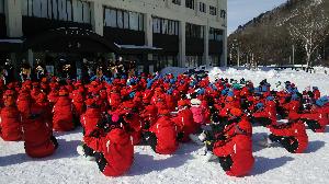 スキー場と宿、生徒たちの集合の状況です。3日間お世話になるインストラクターのみなさんが前に並んでいます。