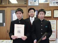 3月7日に文化会館で行われた9ヶ年皆勤賞表彰式において、都合により欠席となった生徒2名が校長室で表彰状の授与を行いました。