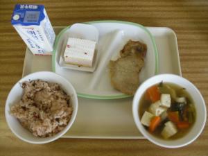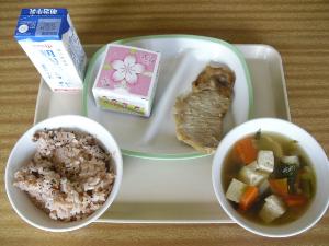 今日の3年生の献立は卒業お祝いということで、赤飯とケーキが出ました。3年生のみなさんが小学1年生から慣れ親しんできた給食も今日で終わりですね。