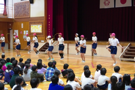 今朝の朝礼では、運動委員会の児童達が縄跳びを全校児童にお披露目しました。