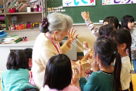 今日も、1年生は三葉会の方々に独楽におはじき、けん玉にあやとり、おてだまなどの昔遊びを教えていただきました。