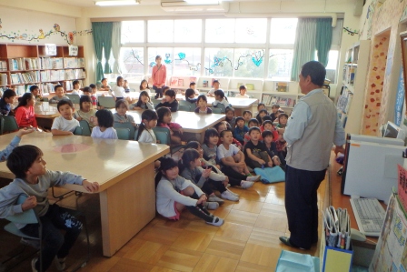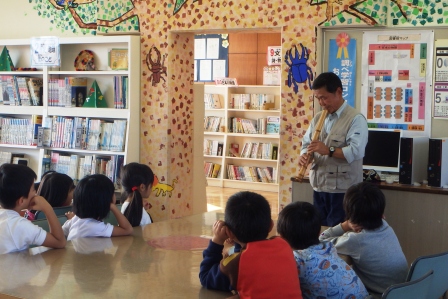 いつも学校の木々を整えてくれる加藤さんが、図書館でハーモニカと尺八のコンサートをしてくださいました。