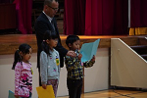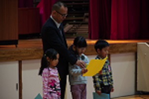 1年生の代表3人が、2学期頑張ったことと3学期頑張りたいことを発表しました。まだ慣れないことが多い中ですが、みんなの前で堂々と発表することができました。