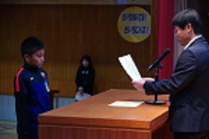 また最後に、表彰も行われました。食育標語コンクールについての表彰でした。5年生1人が、高学年らしい堂々とした素晴らしい態度を見せることができました。