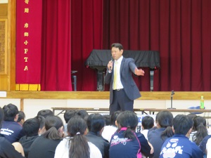 本日、昼休みから三郷市出身で元プロ野球選手(現在は城西大学硬式野球部監督)の小原沢 重頼選手をお招きして夢について話をしていただきました。