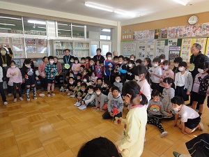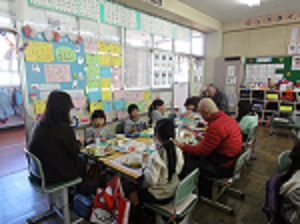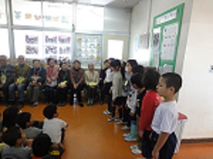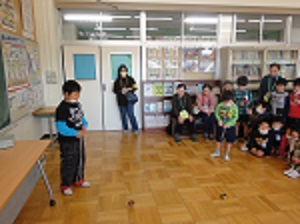 12月にも来ていただいた三葉会の方々をお招きして、昔遊びを教えていただきました。昔遊びを教えていただくのも3回目になり、独楽やけん玉などどんどんうまくなりました。みんなが昔の遊びに夢中になって楽しんでいました。給食も一緒に食べ、楽しい時間を過ごしました。