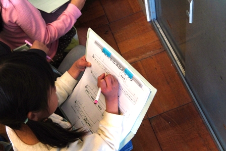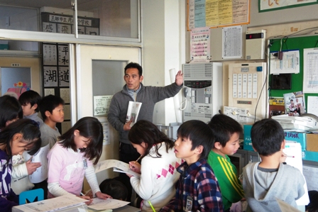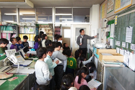 3年生が、学校中を歩いていました。 社会の授業で「火事から暮らしを守る」というテーマで、 学校にはどんな防災・防火の設備があるのかを探していました。 職員室には消防署にすぐにつながる通報設備がついているのを確認していました。