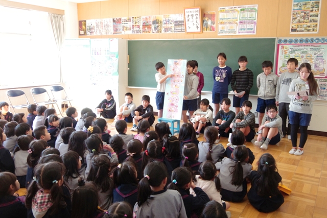 彦郷小からは、最初に図書委員会の児童達が絵本「100かいだてのいえ」の読み聞かせを行いました。中には内容を暗記をして原稿を持たずに読み上げている児童もいました。