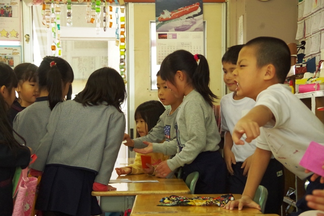 本日は幼小交流会が行われ、みやおか幼稚園の子ども達が彦郷小学校にやってきました。