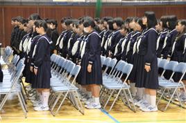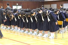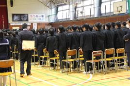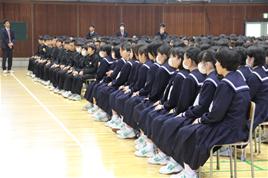 卒業証書授与式まであと1週間ほどとなり、全校での練習が始まっています。今回は、基本的な所作を中心とした練習でした。体育館の中は、司会をする先生の声と外で激しく降る雨の音、また、号令に合わせた時の音しか聞こえてこないくらいにとても静かでした。