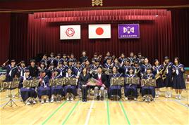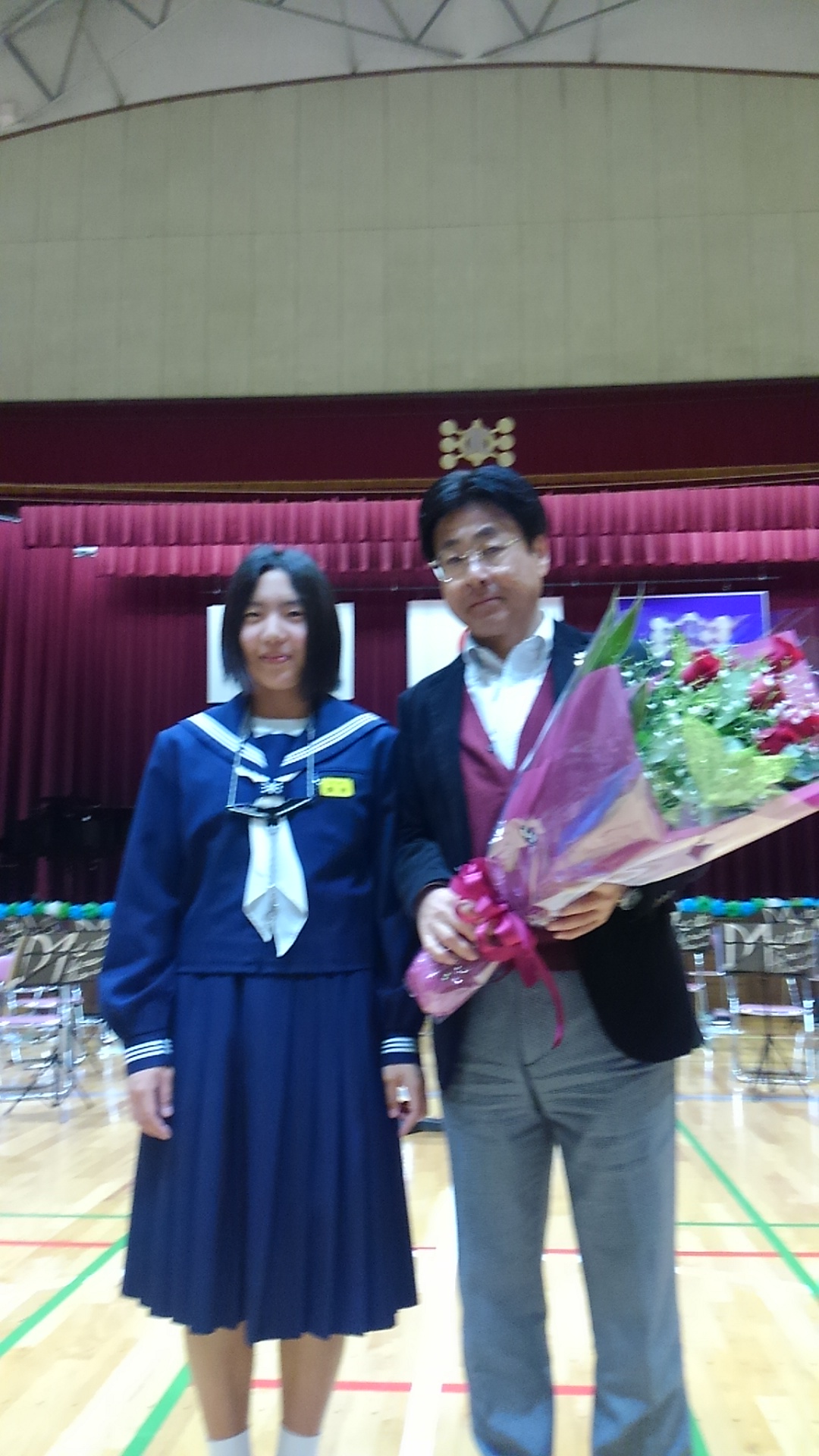 演奏会終了後、吹奏楽部生徒および保護者から、一之瀬一彦校長先生に花束が贈られました。これは、暑い日も寒い日も一日も欠かすことなく吹奏楽部の演奏会に足を運んでくださった校長先生への感謝の気持ちを表したものです。写真は吹奏楽部長と一之瀬一彦校長先生です。