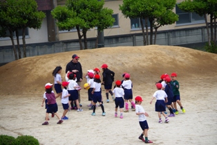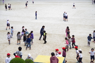 休み時間、雨も止んでいたので児童達は担任の先生と校庭で元気よく遊んでいました。