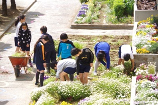 校務員の阿部さんをはじめとして、園芸委員やボランティア・応援団の方々が
