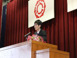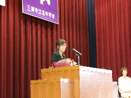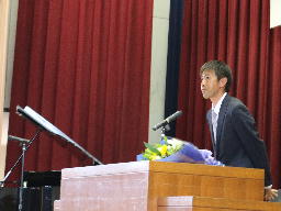 2年生の皆さん3年生の皆さんお久しぶりです。1年生の皆さんは初めましてという形になりますが、去年6月からという短い期間だったのですが、家庭科の授業をやらせていただきまして、非常に楽しかったです。みんなの笑顔に囲まれていられた9ヶ月間が非常にキラキラしていたものだなと今になって思います。一人一人がキラキラしている自分には気づいていたいと思いますが、みんなとっても輝いています。これからますます輝き続けていてほしいなと思います。本日はありがとうございました。