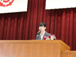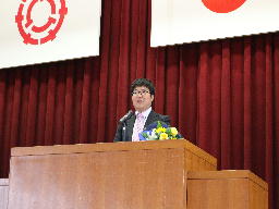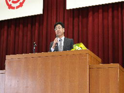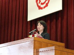 こんにちは。(中略)事務という仕事は皆さんよりもどちらかというと先生方に関する仕事の方が多かったので、なかなか顔を合わせる機会がなかったかもしれないのですが、私の方から一言だけ言葉を残したいと思います。「このあいさつを待っていました」と最初に言いましたが、やはり北中生はあいさつがいいなと思いました。今日、ここに来るときに階段を上った途中で、ものすごく大きな声であいさつをしてくれた生徒さんがいました。これはすごく受ける側も気持ちいいなと思いますし、言った方もきっと心からの気持ちがあったからこそのあいさつだったと思います。あいさつは中学校にいるときだけではなくて、高校に行っても就職してもあいさつはとても大事になります。あいさつがどのくらい大きな声でしっかりと言えるのかは、今後の人生を左右すると言っても過言ではないと思います。あいさつは絶対武器になります。この北中生の立派なあいさつを大きくなっても大人になっても続けてもらいたいと思います。私からの話は以上です。