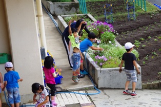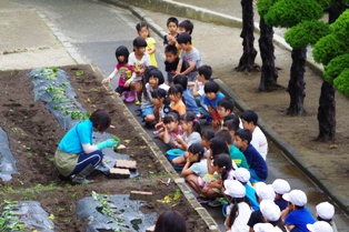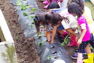 校務員の阿部さんのご指導の下、それぞれの畝に穴を掘って植えていきました。