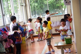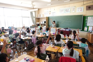 掃除の時間、1年生には6年生のお兄さんやお姉さんが手伝いに来てくれています。